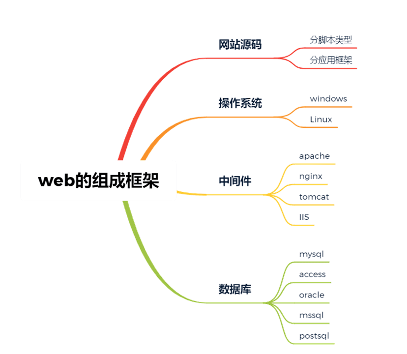 WEB的组成框架模型:网站源码、操作系统、中间件(搭建平台,提供服务的)、数据库。