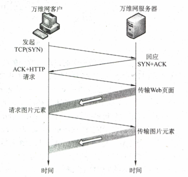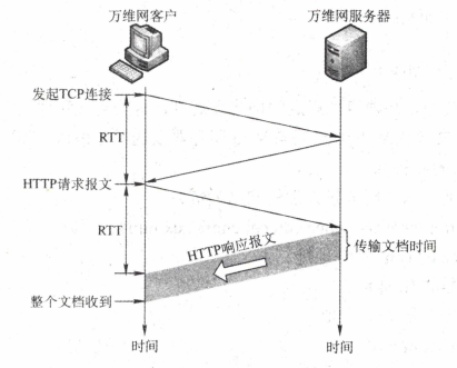 请求一个万维网文档所需的时间 是该文档的 传输时间 (与文档大小成正比) 加上两倍往返时间RTT (一个RTT用于TCP连接,另一个RTT用于请求和接收文档)。