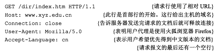 在 请求行 使用了相对URL(即省略了主机的域名)是因为下面的首部行(第2行)给出了 主机的域名 。第3行是告诉服务器 不使用持续连接 ,表示浏览器希望服务器在传送完所请求的对象后即 关闭TCP连接 。这个请求报文 没有实体主体 。