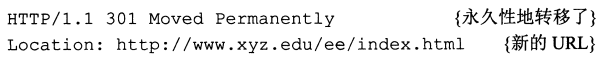 若请求的网页转移到了一个新的地址,则响应报文的状态行和一个首部行就是下面的形式:
