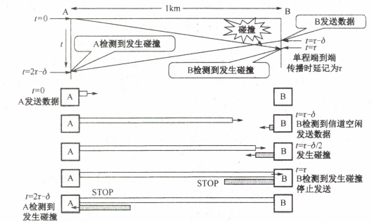 当t=0时,开始向链路发送数据:当t=1μs时,信号传播到200m处,注入链路1比特:当t=2μs时,信号传播到400m处,注入链路共2比特:当t=3μs时,信号传播到600m处,注入链路共3比特。